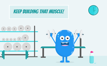 Blue, bean-shaped Copey character in martial arts uniform, standing in front of broken wood on cinder blocks