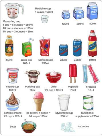 Fluids include water, milk, tea, juice and pop. Food that is liquid at room temperature also counts as fluid. This includes ice cream, popsicles, freezies, yogurt and soup.